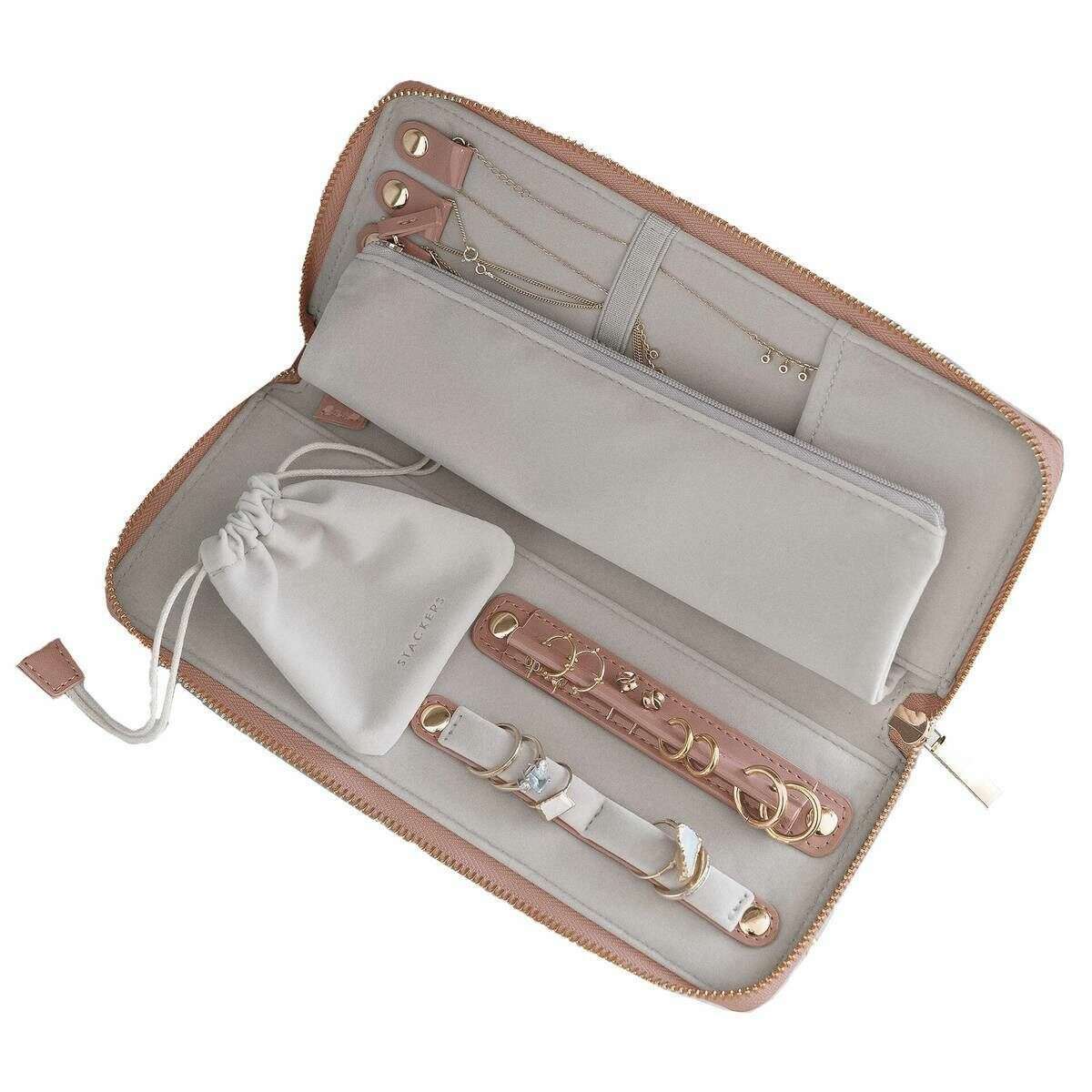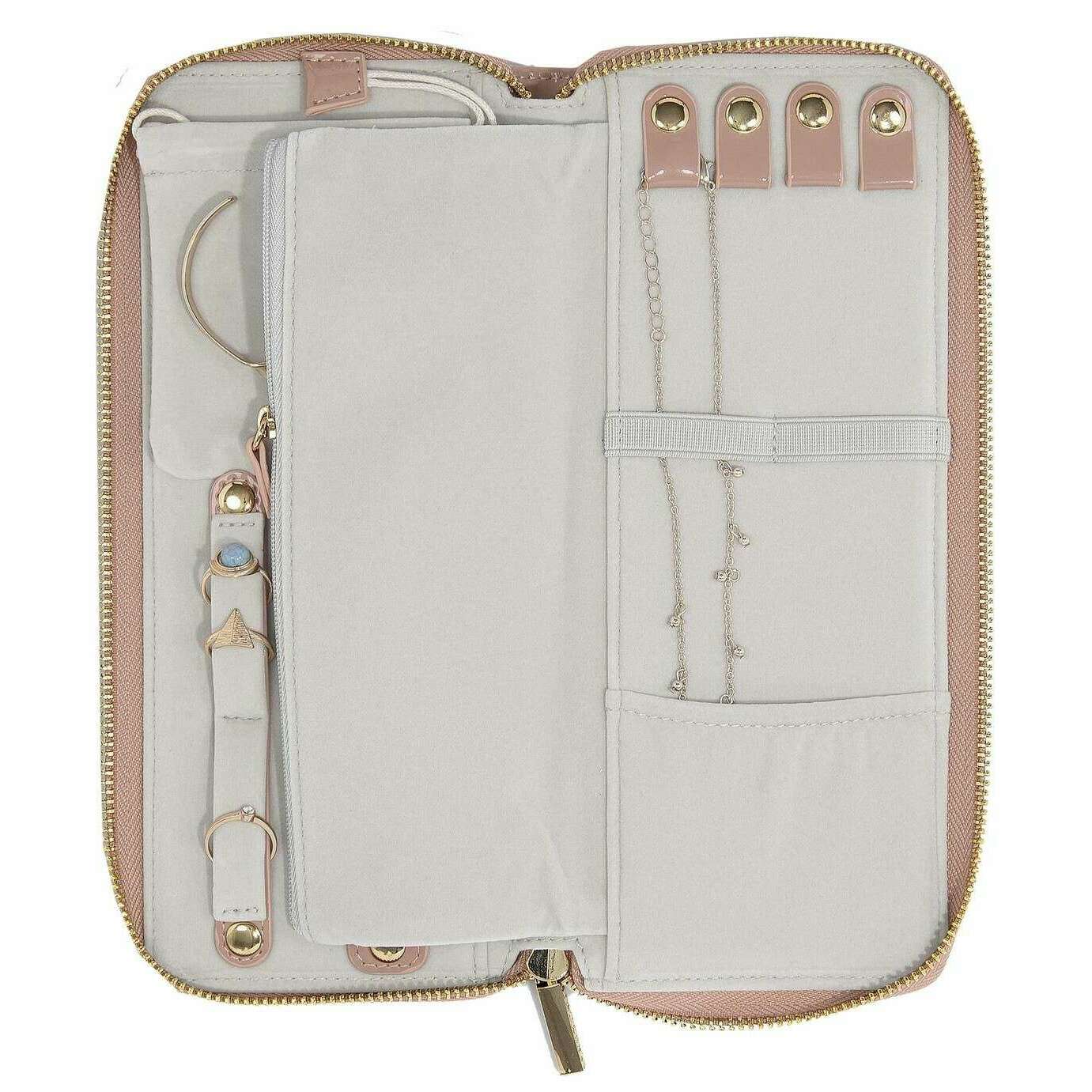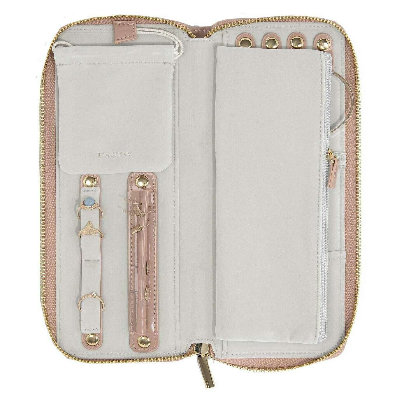 This jewellery roll for women is fashioned by the brand Stackers in a pink colour and is made from faux leather. It measures 3cm(height) x 24.5cm(width) x 10.3cm(depth). All the jewellery boxes come complete with stackers packaging. The Stackers Jewellery Roll - Patent Rose Pink is a must have when on the go! This pink jewellery roll is perfect for travelling with jewellery and includes a zip closure for extra security.