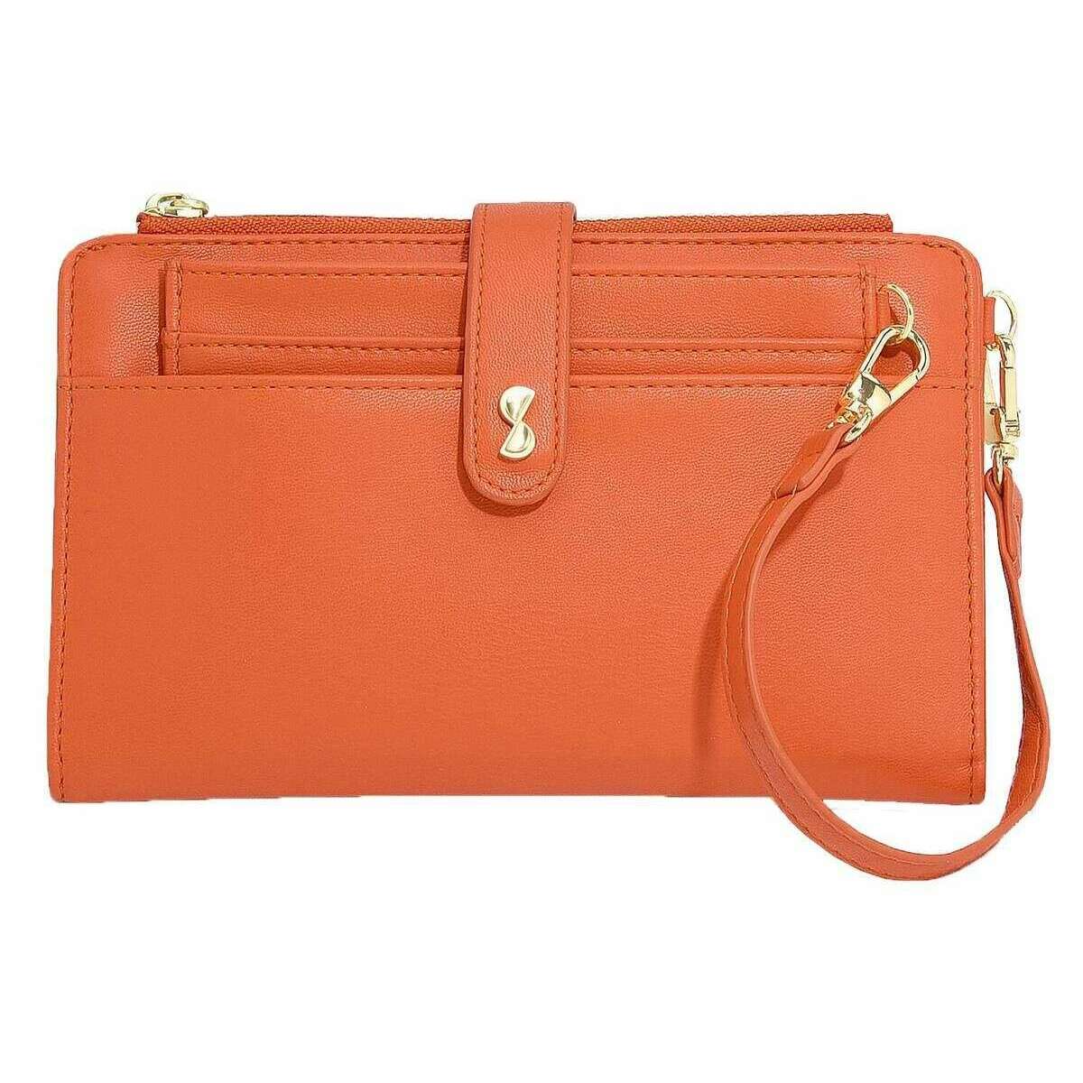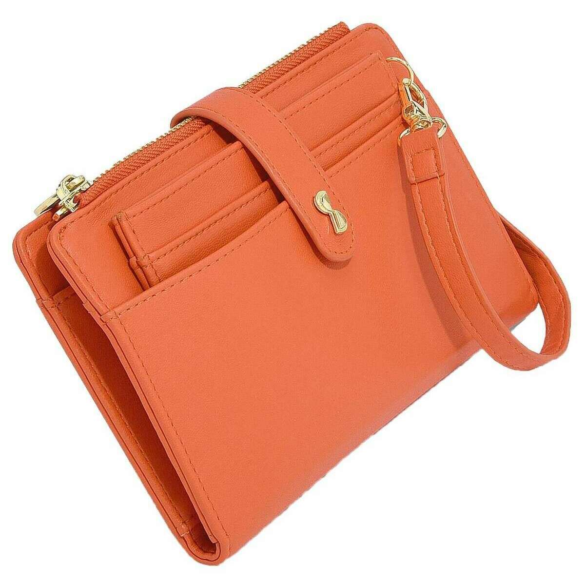 Manufactured from faux leather is this orange women's large purse by the designer Stackers. It measures 12.5cm(height) x 19.5cm(width) x 3cm(depth). All the purses come complete with stackers packaging. The Stackers Large Purse - Orange is a must have when on the go! This classic and trendy orange purse features multiple pockets for money and cards, a removable card purse and a cosmetic mirror. Comes complete with a removable wrist strap and external phone pocket. Perfect for any outing!