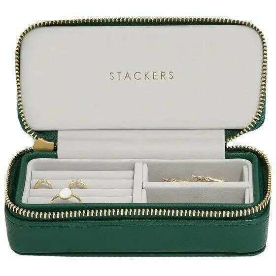 This women's medium travel jewellery box has been made from faux leather and velvet, featured in a green colour and is from the brand Stackers. It measures 4.5cm(height) x 15.5cm(width) x 7cm(depth). All the jewellery boxes come complete in stackers packaging. The Stackers Medium Travel Jewellery Box - Forest Green is an ideal travel essential to keep your jewellery safe in one place. Guaranteed not to disappoint, this will be certain to impress with its small size and soft interior featuring a ring or stud earring section, and two larger sections. Make this a must have for any stylish woman who travels with jewellery.