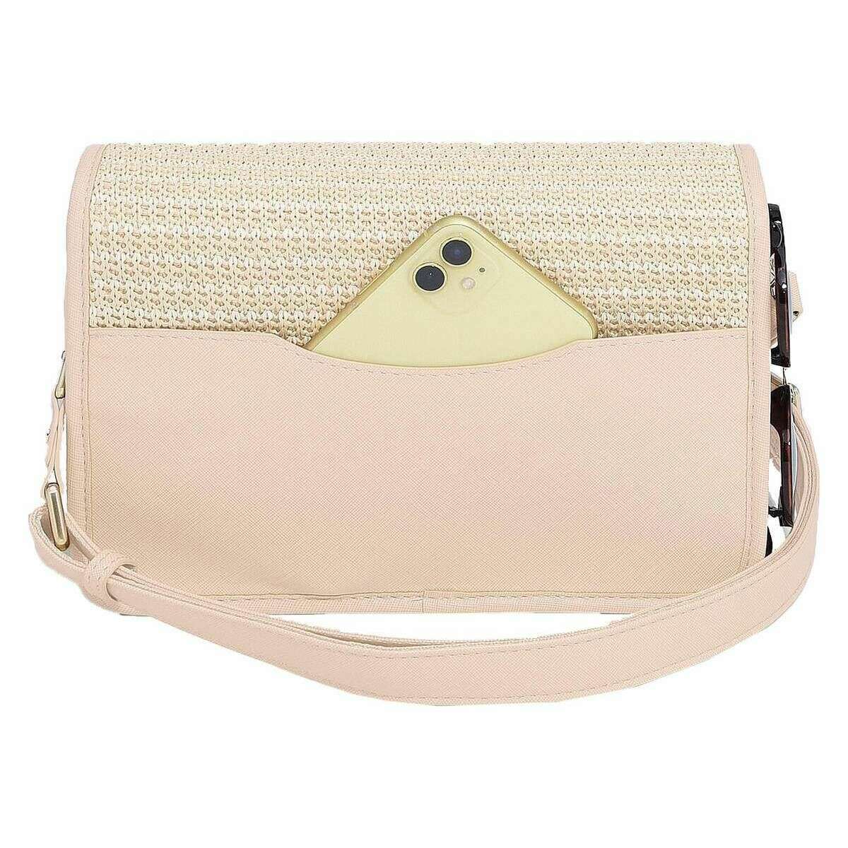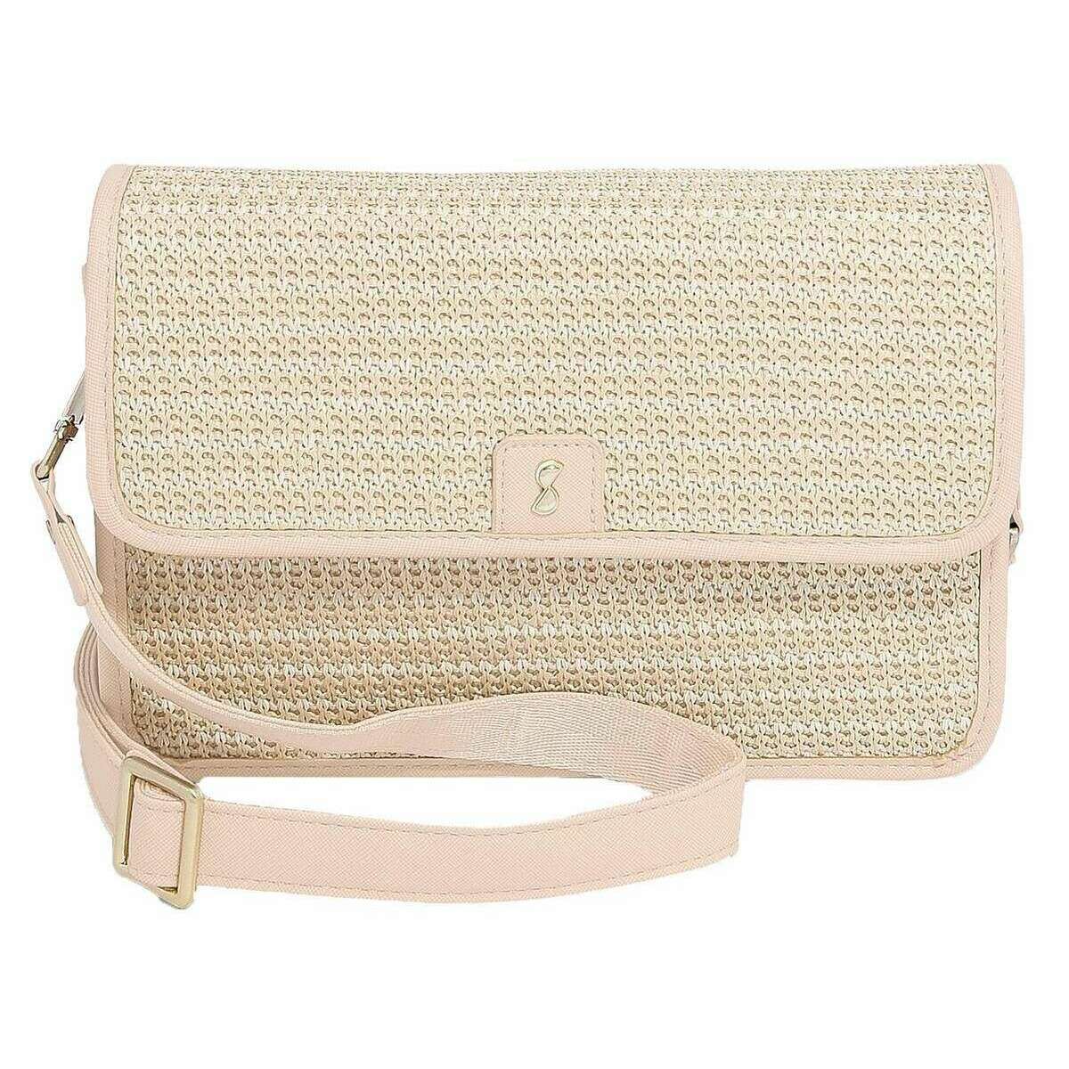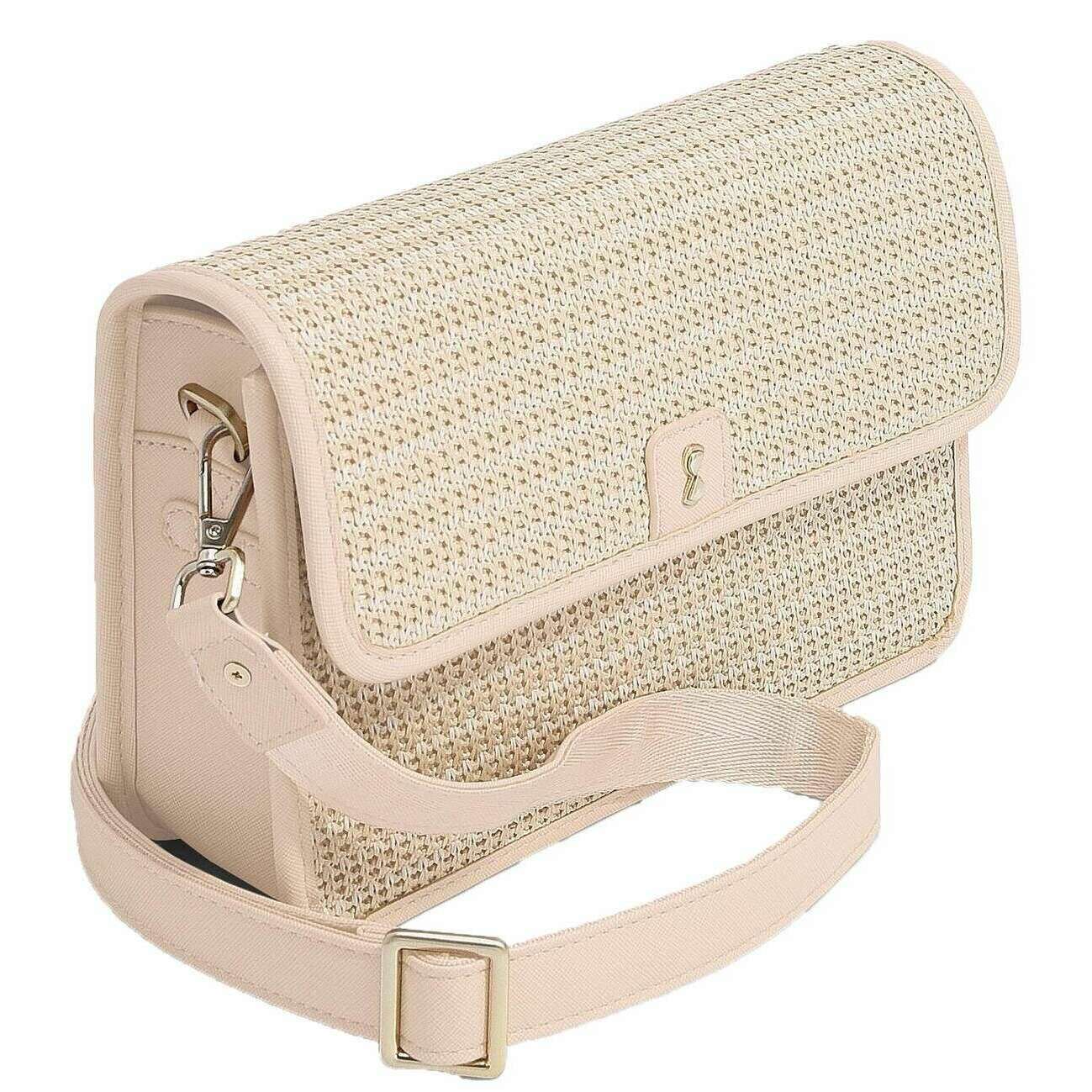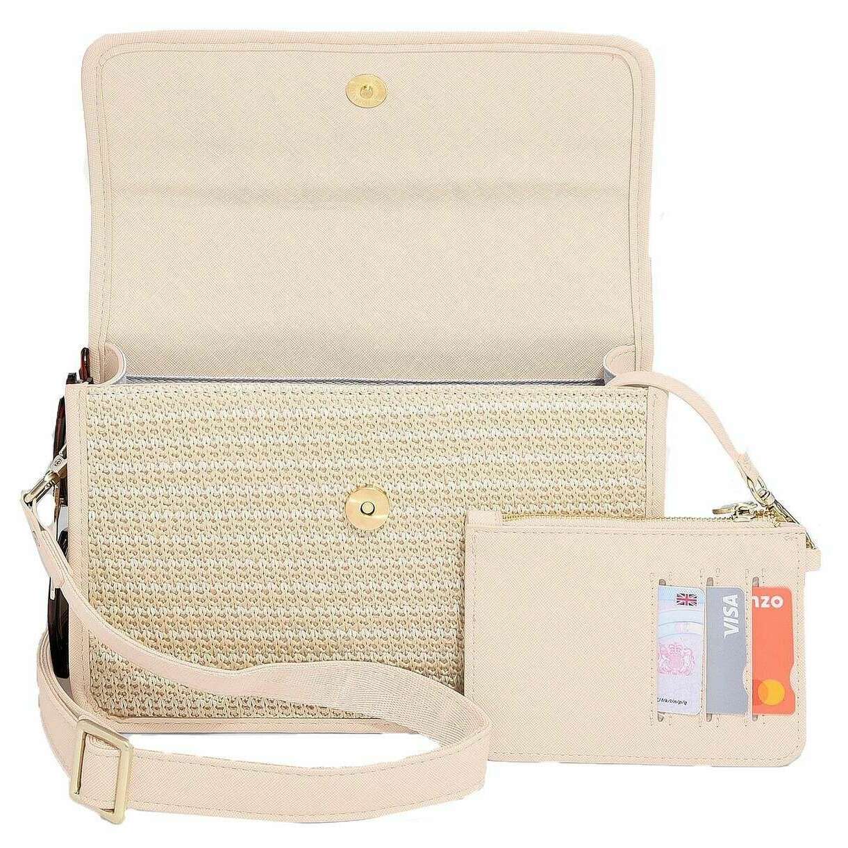This raffia crossbody bag for women is fashioned by the brand Stackers in a pink colour and is made from raffia effect and faux leather. It measures 17cm(height) x 7.5cm(width) x 25cm(depth). All the bags come complete with stackers packaging. The Stackers Raffia Crossbody Bag - Blush Pink Raffia is a must have when on the go! This unique and trendy pink raffia crossbody bag features multiple pockets, a stackers cosmetic mirror and a removable card purse. Perfect for everyday use with its removable and adjustable crossbody strap.