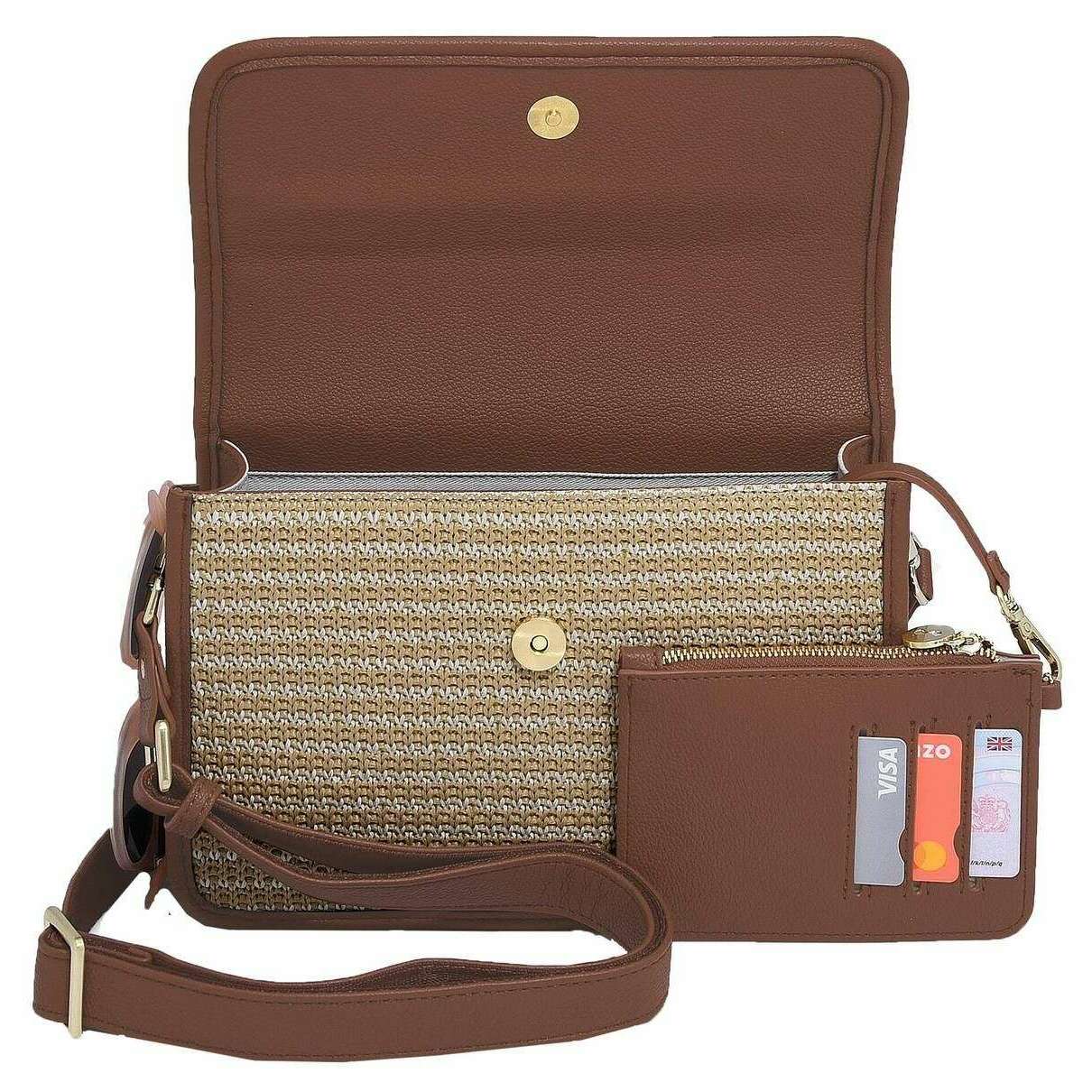 Perfect for women is this Stackers tan raffia raffia crossbody bag, it is also made from raffia effect and faux leather. It measures 17cm(height) x 7.5cm(width) x 25cm(depth). All the bags come complete with stackers packaging. The Stackers Raffia Crossbody Bag - Tan Raffia is a must have when on the go! This unique and trendy tan raffia crossbody bag features multiple pockets, a stackers cosmetic mirror and a removable card purse. Perfect for everyday use with its removable and adjustable crossbody strap.