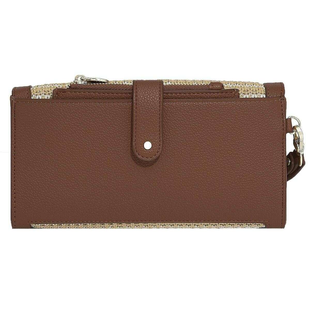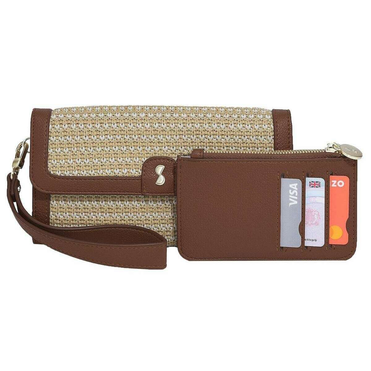 Brought to you by the brand Stackers, this tan raffia women's raffia purse is made from raffia effect and faux leather. All the purses come complete with stackers packaging. The Stackers Raffia Purse - Tan Raffia is a must have when on the go! This unique and trendy tan raffia purse features multiple pockets for money or cards, a removable card purse and a cosmetic mirror. Comes complete with a removable wrist strap for diverse use.
