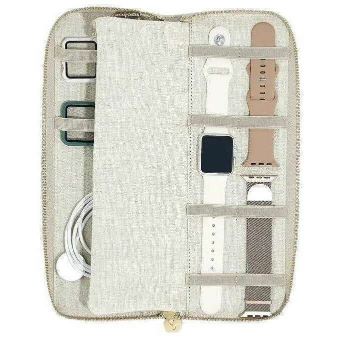 This women's smart watch organiser by the brand Stackers is made from faux leather and linen and is showcased in beige. All the jewellery boxes come complete in stackers packaging. The Stackers Smart Watch Organiser - Oatmeal/Linen Beige will help you to stay neat and organised, erasing the stress of trying to find the parts to your watch. With elasticated loops to securely hold items such as watches and straps, and additional loops on the other side to hold accessories and charging cables this perfectly practical case features zip fastening and has been manufactured with durable materials to ensure safe transport.