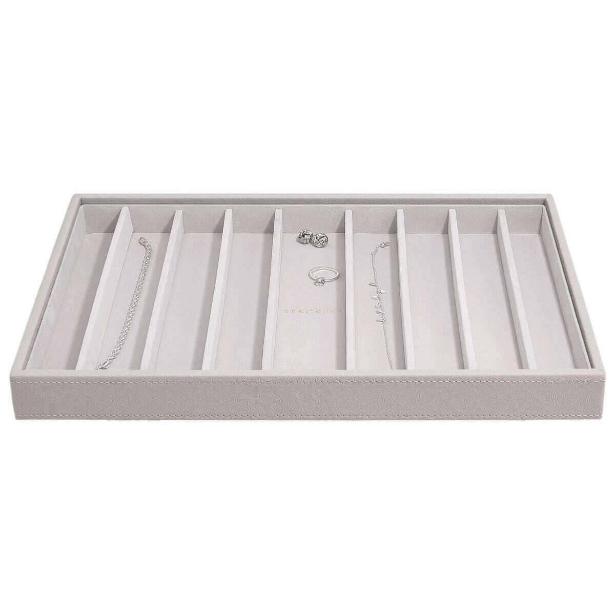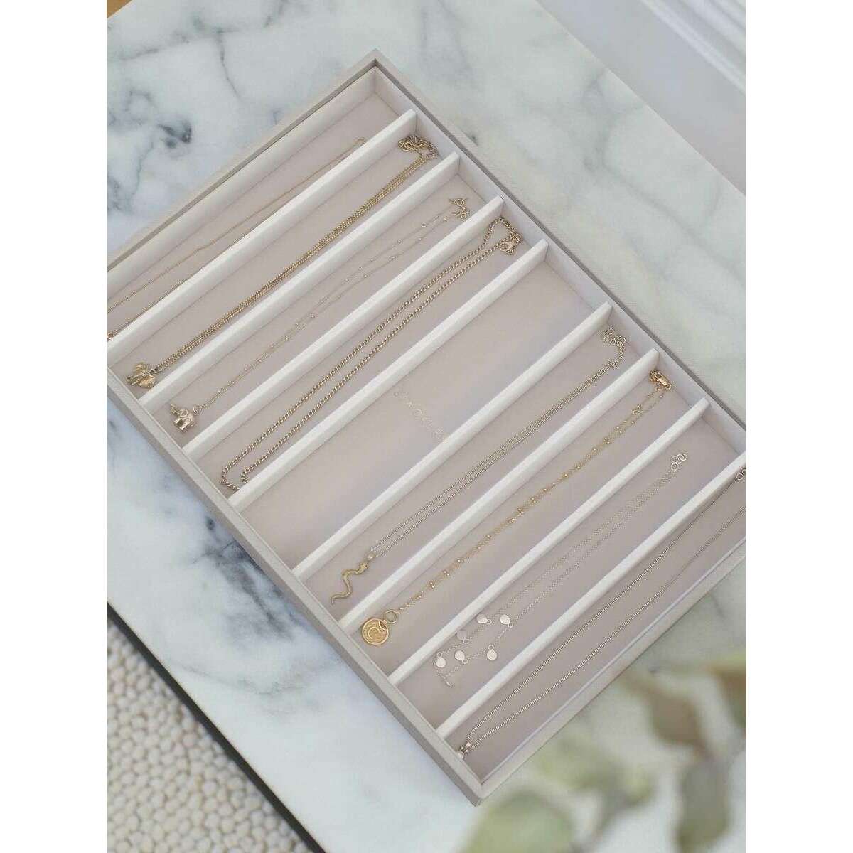 This well made women's supersize necklace layer from Stackers comes in a taupe beige colour and is manufactured from faux leather and velvet. It measures 4cm(height) x 36cm(width) x 23.9cm(depth). It is recommended to wipe clean to keep this jewellery box in good condition. All the jewellery boxes come complete with stackers packaging. The Stackers Supersize Necklace Layer - Taupe Beige has been designed to keep your necklaces organised and tangle free. With a soft velvet interior, this will be certain to impress those who have lots of jewellery to organise and keep safe from getting damaged. This is perfect to keep on your chest of drawers or dresser due to its simple design making it go with any room, or it can be combined with other supersize layers to create your perfect jewellery box.