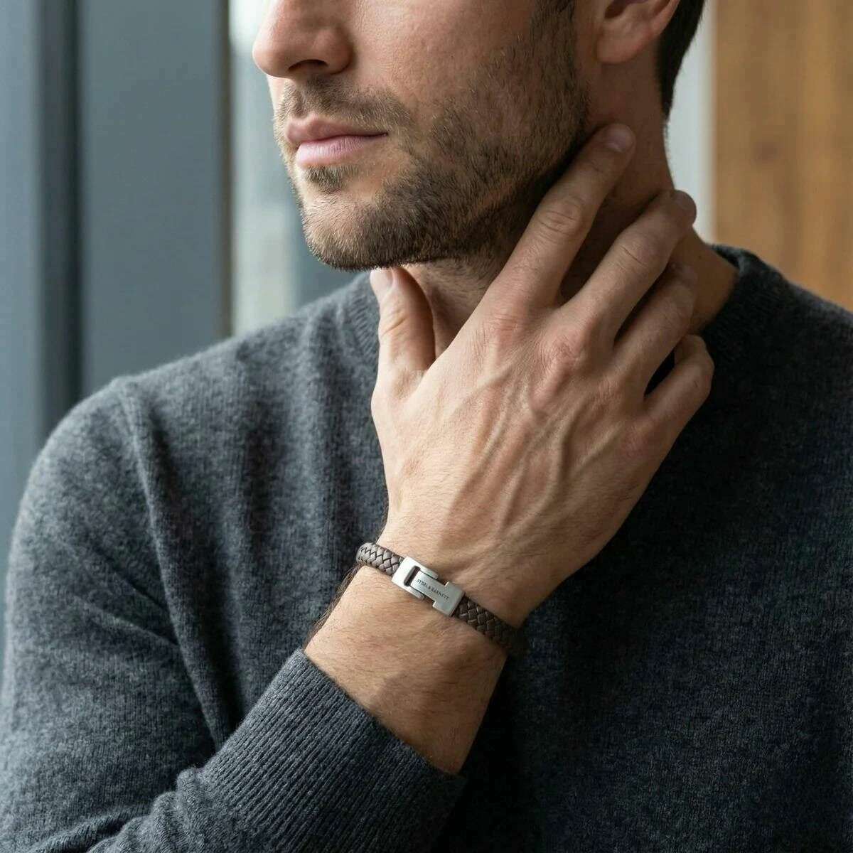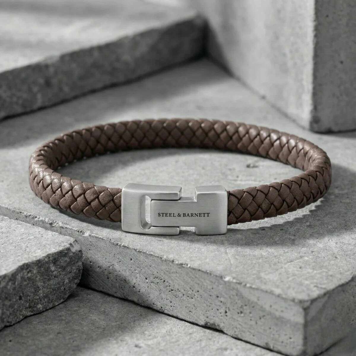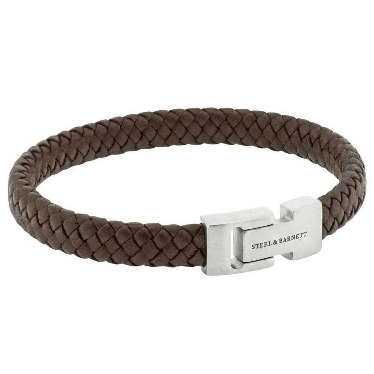Introducing this men's archie braided leather bracelet by Steel & Barnett, it is manufactured from 100% nappa leather and stainless steel in a brown colour. All the bracelets come complete with steel & barnett packaging. The Steel & Barnett Archie Braided Leather Bracelet - Brown embodies the perfect balance of simplicity and elegance. Expertly hand crafted from genuine Nappa leather, its smooth 8mm band delivers a clean, minimalist aesthetic suitable for any style. The design is elevated by a signature brushed silver clasp, finely engraved with the STEEL & BARNETT logo, offering a subtle touch of distinction. Built for longevity, the bracelet features a high?grade 316L stainless steel clasp, celebrated for its durability and corrosion resistance. Its magnetic fastening ensures effortless wear, providing a secure and comfortable fit throughout the day. Versatile and refined, the Archie transitions seamlessly from formal occasions to casual settings, adding a layer of understated sophistication to every outfit.