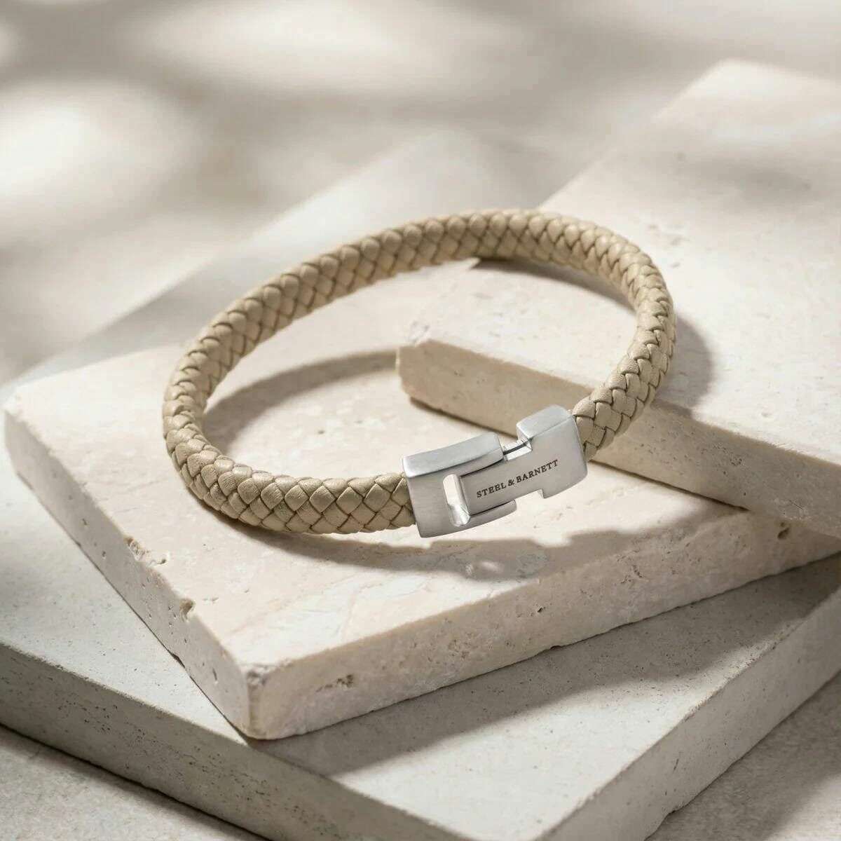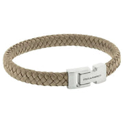 Manufactured from 100% nappa leather and stainless steel is this ecru cream men's archie braided leather bracelet by the designer Steel & Barnett. All the bracelets come complete with steel & barnett packaging. The Steel & Barnett Archie Braided Leather Bracelet - Ecru Cream embodies the perfect balance of simplicity and elegance. Expertly hand crafted from genuine Nappa leather, its smooth 8mm band delivers a clean, minimalist aesthetic suitable for any style. The design is elevated by a signature brushed silver clasp, finely engraved with the STEEL & BARNETT logo, offering a subtle touch of distinction. Built for longevity, the bracelet features a high?grade 316L stainless steel clasp, celebrated for its durability and corrosion resistance. Its magnetic fastening ensures effortless wear, providing a secure and comfortable fit throughout the day. Versatile and refined, the Archie transitions seamlessly from formal occasions to casual settings, adding a layer of understated sophistication to every outfit.