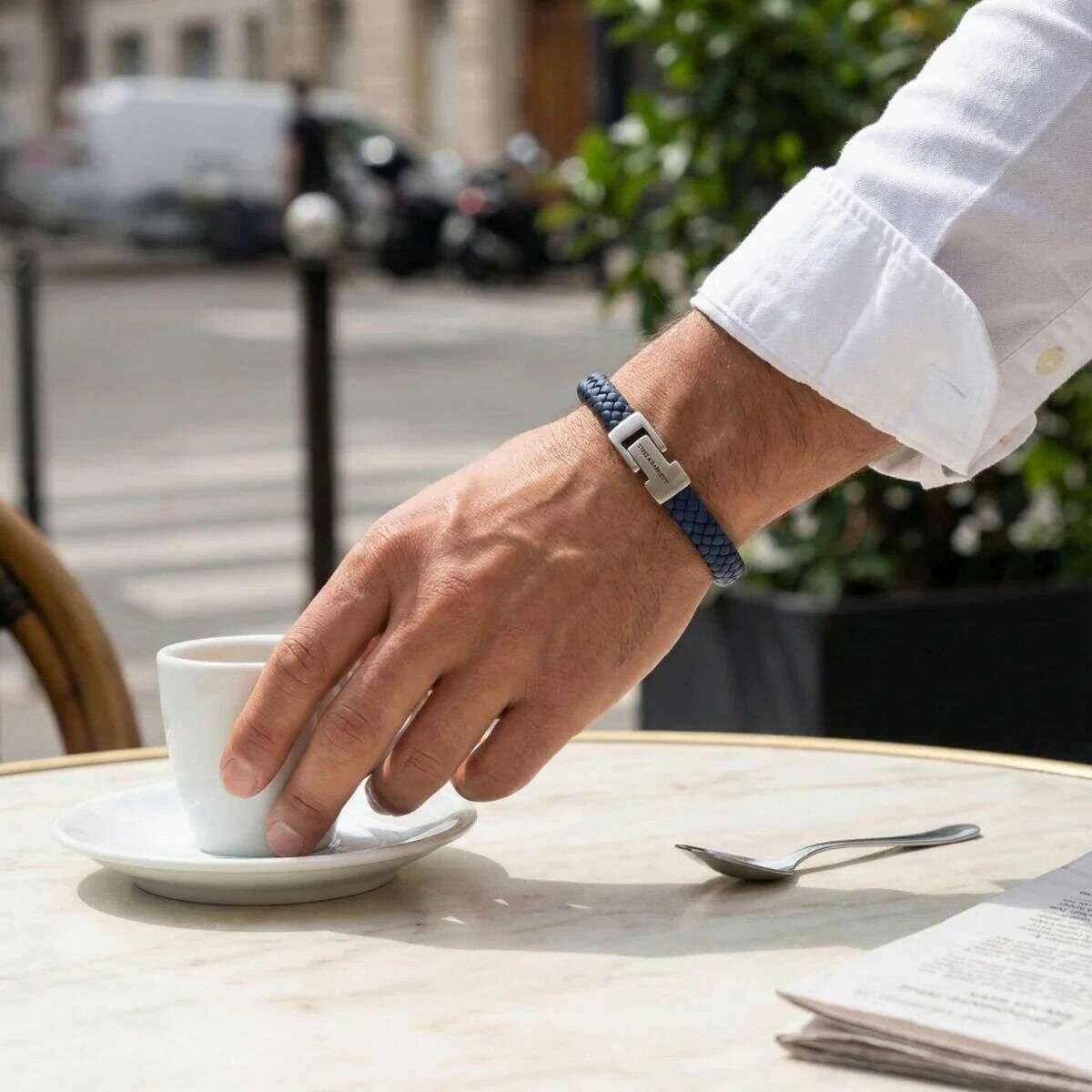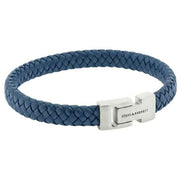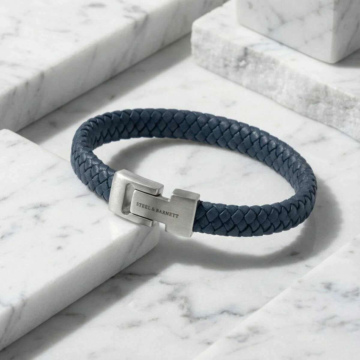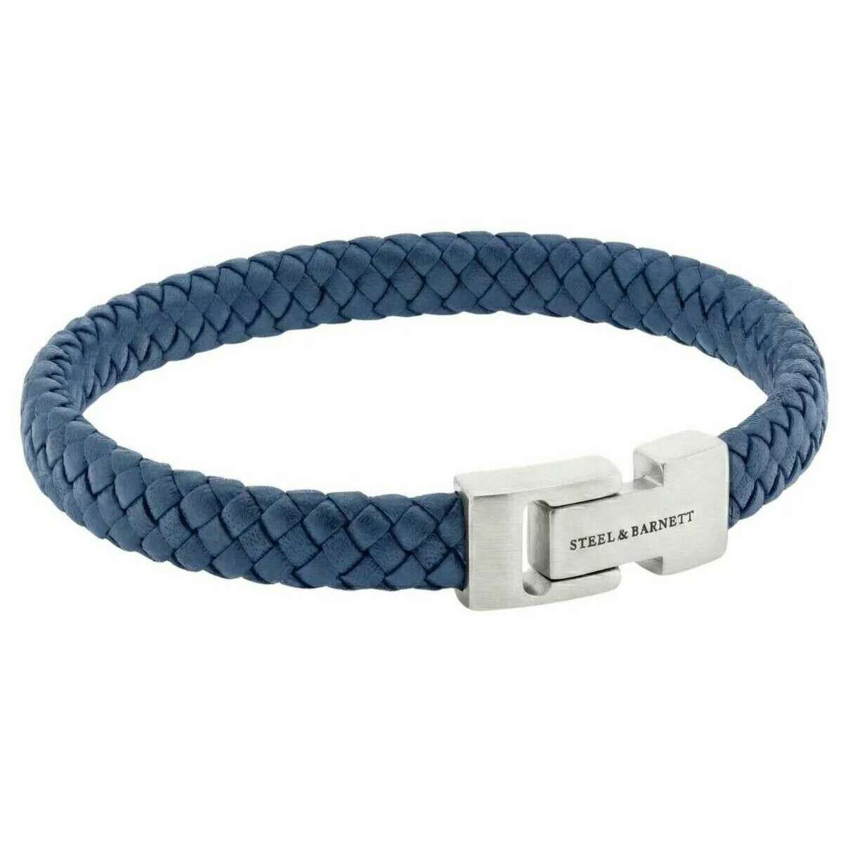 This men's archie braided leather bracelet has been made from 100% nappa leather and stainless steel, featured in a blue colour and is from the brand Steel & Barnett. All the bracelets come complete with steel & barnett packaging. The Steel & Barnett Archie Braided Leather Bracelet - Jeans Blue embodies the perfect balance of simplicity and elegance. Expertly hand crafted from genuine Nappa leather, its smooth 8mm band delivers a clean, minimalist aesthetic suitable for any style. The design is elevated by a signature brushed silver clasp, finely engraved with the STEEL & BARNETT logo, offering a subtle touch of distinction. Built for longevity, the bracelet features a high?grade 316L stainless steel clasp, celebrated for its durability and corrosion resistance. Its magnetic fastening ensures effortless wear, providing a secure and comfortable fit throughout the day. Versatile and refined, the Archie transitions seamlessly from formal occasions to casual settings, adding a layer of understated sophistication to every outfit.