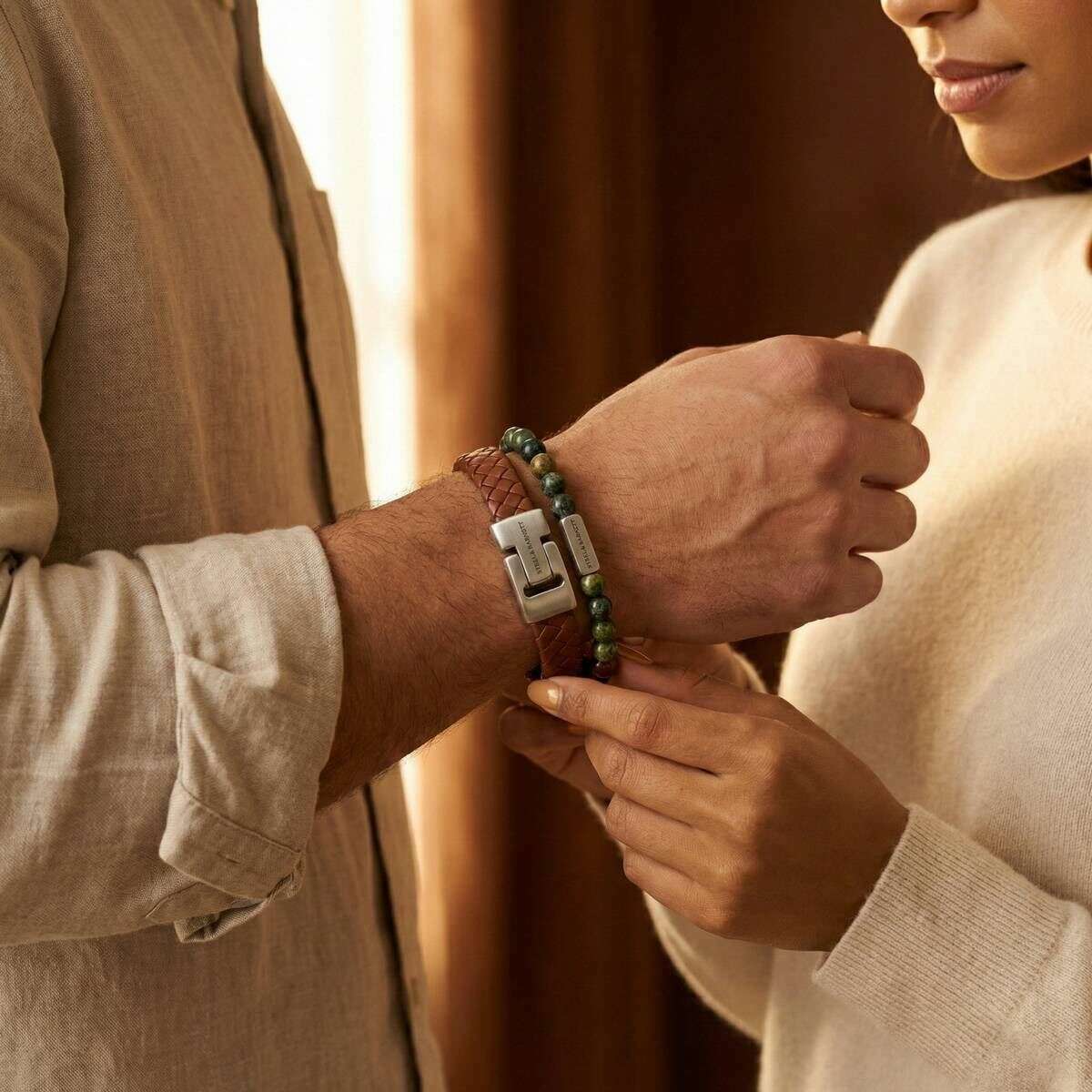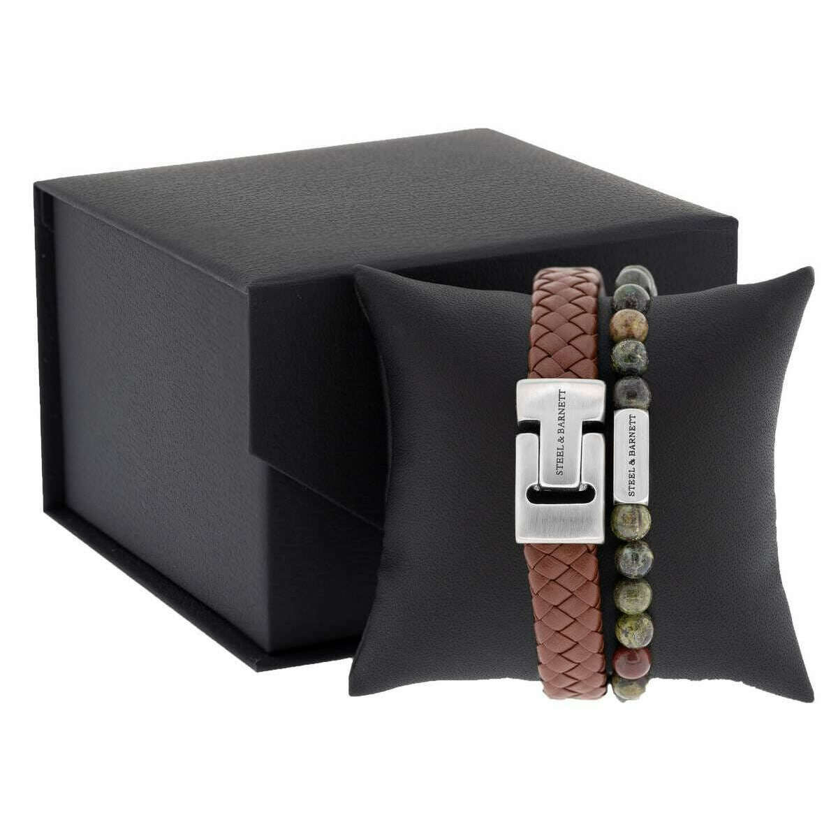 This men's duo bracelet gift set has been made from 100% leather, stainless steel and gemstones, featured in a tan colour and is from the brand Steel & Barnett. All the bracelets come complete with steel & barnett gift box. The Steel & Barnett Duo Bracelet Gift Set - Cognac Tan presents a refined combination that beautifully balances elegance with earthy charm. The rich cognac leather bracelet offers timeless warmth and texture, while the serpentine gemstone bracelet introduces a natural, grounding element with its distinctive character and subtle sophistication. Thoughtfully paired, these two pieces complement one another effortlessly creating a harmonious blend of organic tones and refined craftsmanship. Perfect for any occasion, this set adds a touch of natural sophistication and understated style to any outfit, making it an exceptional choice for those who appreciate both modern elegance and nature?inspired design.