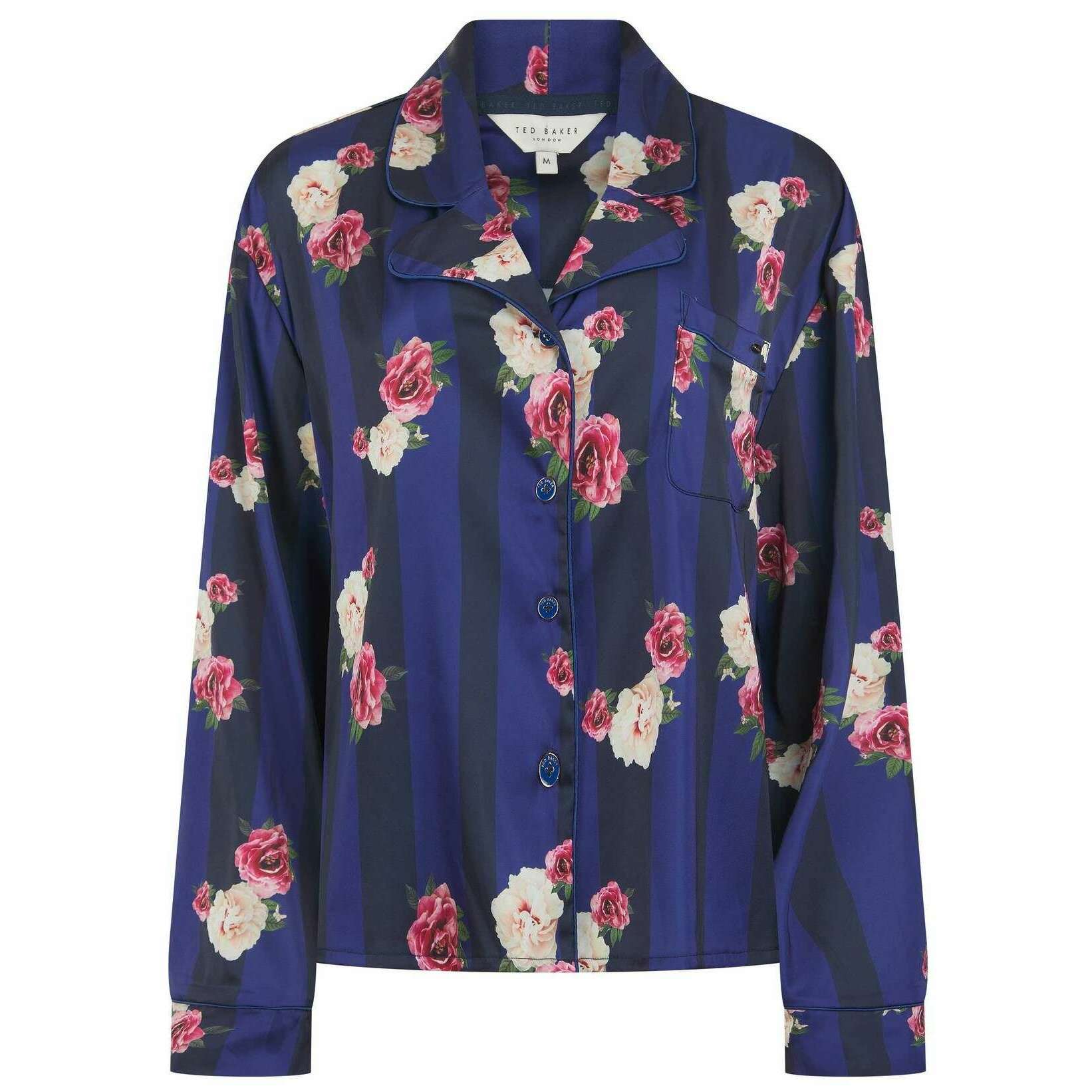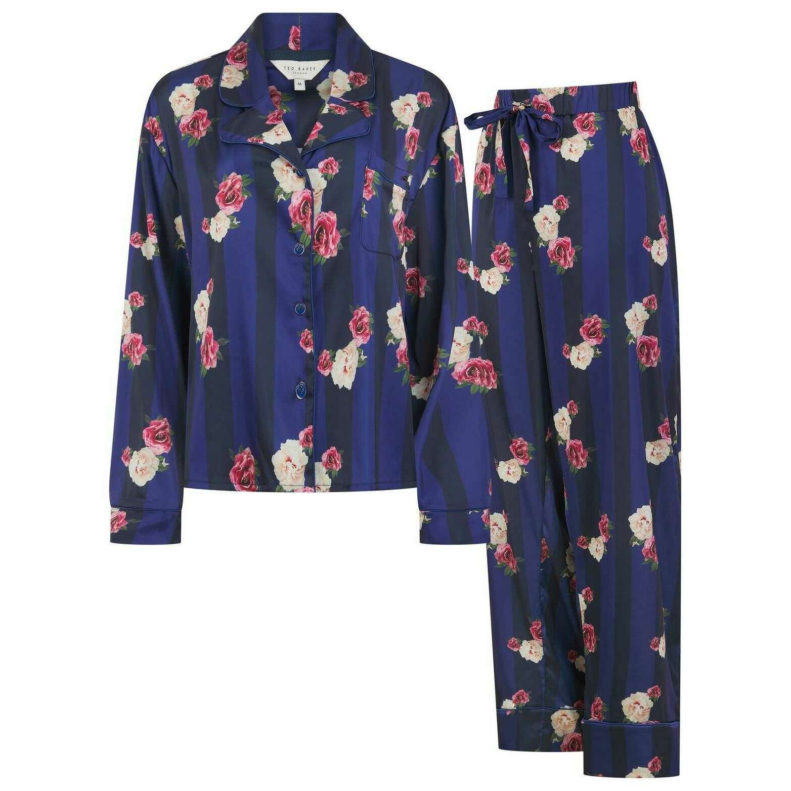 These women's hallie traditional pyjamas by the brand Ted Baker are made from 97% polyester and 3% spandex and are showcased in navy. Also the navy pyjamas are designed in a floral pattern, All the pyjamas come complete with ted baker packaging. The Ted Baker Hallie Traditional Pyjamas - Navy feature a striped background with a floral design all over. These pjs are the perfect pair for any woman featuring long sleeves and trousers to ensure warmth whilst having a satin finish for a breathable wear. These also feature an elasticated waistband and tie for a great fit with loose arms and legs for flow throughout. These would make the perfect gift to a girly loved one. Finished with a Ted Baker metal embellishment tag on both top and bottom.
