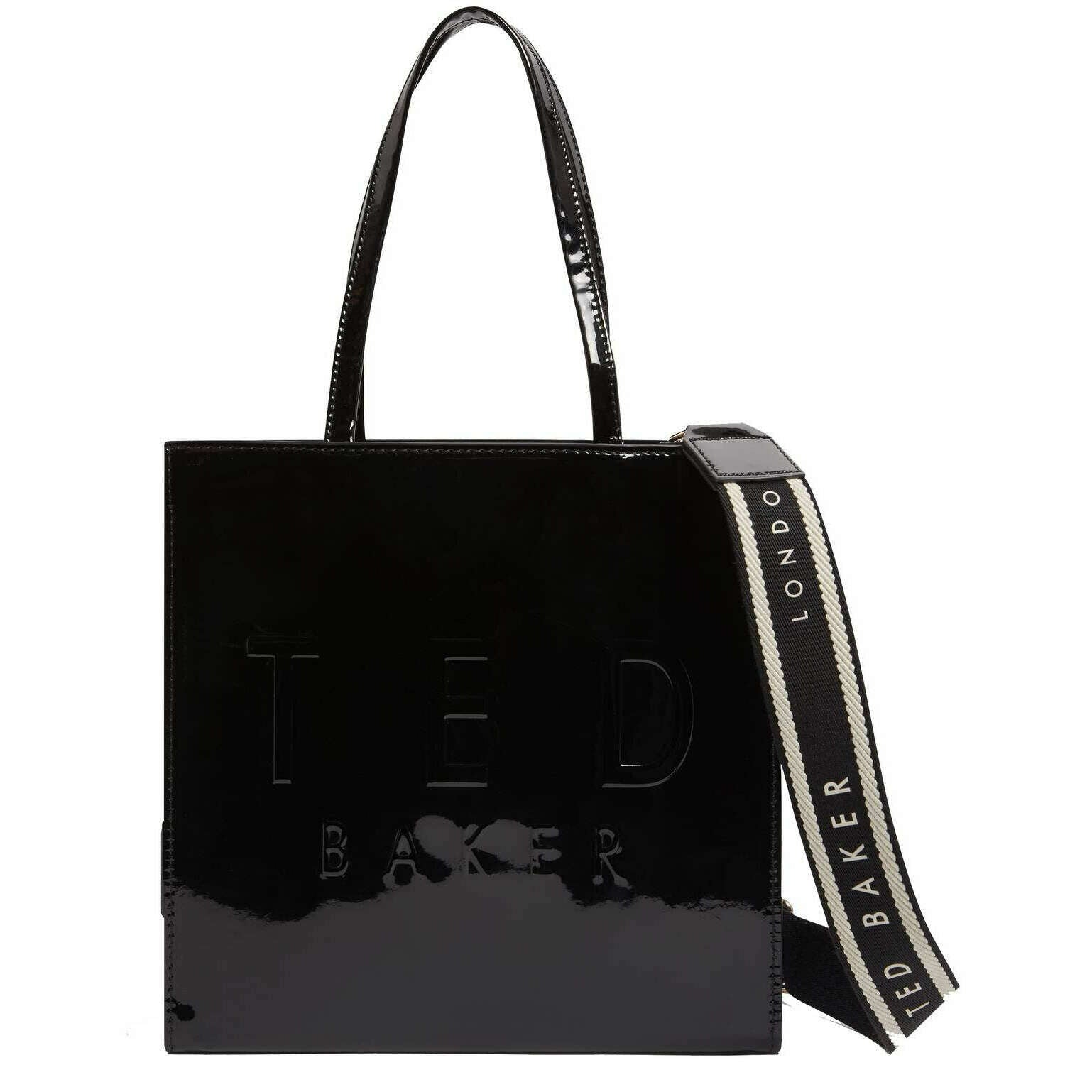 This well made women's iconica webbing small icon bag from Ted Baker comes in a black colour and is manufactured from 100% polyurethane. It measures 25cm(height) x 25cm(width) x 6cm(depth). All the bags come complete with ted baker packaging. The Ted Baker Iconica Webbing Small Icon Bag - Black features a high shine finish with a gorgeous and stand out multi -toned webbed strap, giving you a sleek, modern accessory with a perfect balance of elegance and contemporary flair. Dual top handles offer classic carrying and embossed branding can be seen on the front as well as bold branding on the strap. Carry this bag seamlessly into your day to, fitting in with a casual look as well as offering a more polished look.