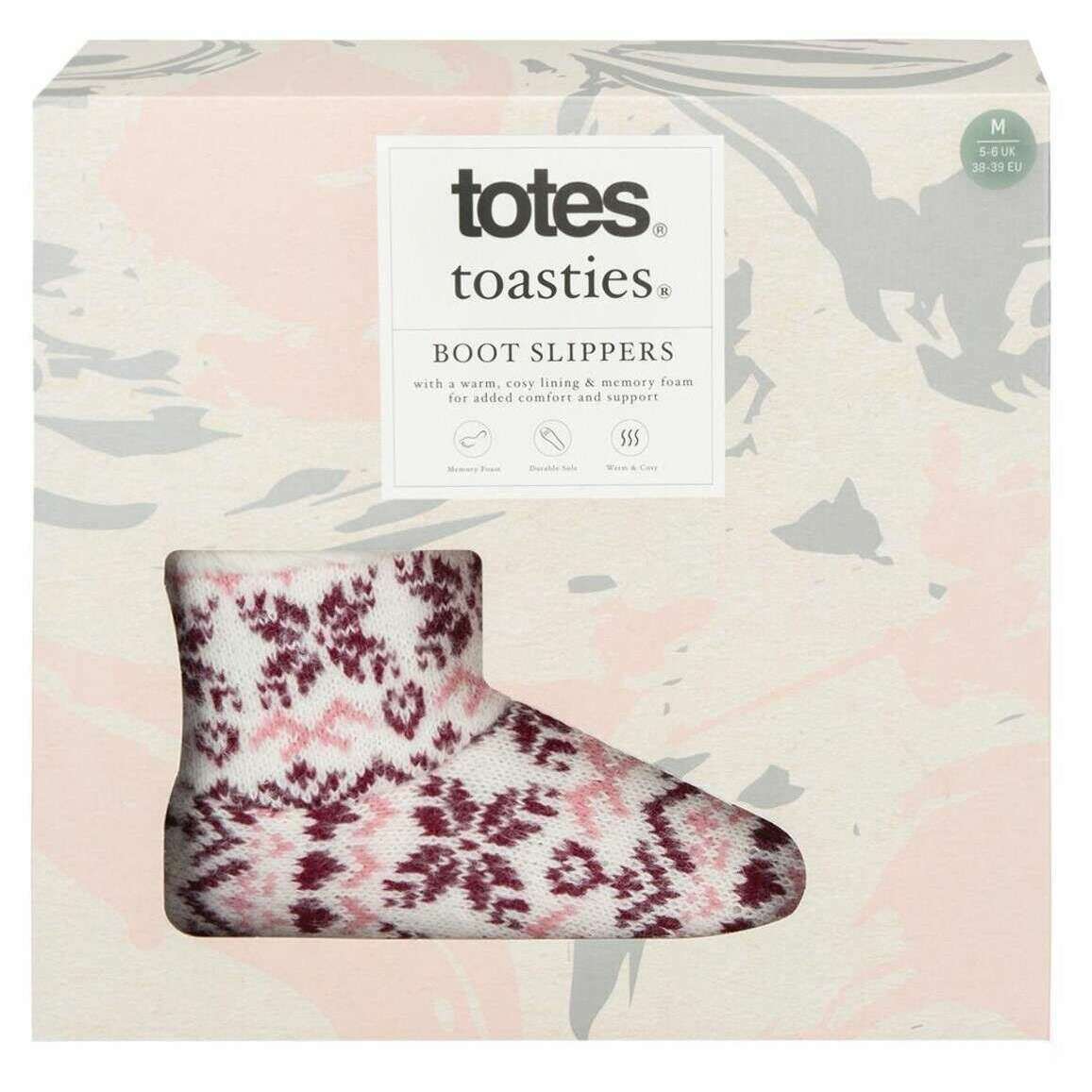 Introducing these women's fair isle boot slippers by Totes Toasties, they are manufactured from 60% polyester, 40% acrylic and synthetic suede in a fairisle purple colour. Also the fairisle purple slippers are designed in a fairisle pattern, All the slippers come complete with totes toasties packaging. The Totes Toasties Fair Isle Boot Slippers - Fairisle Purple will pair perfectly with any of your wintery PJs for a complete cosy look to relax after a long cold day. The boot length not only keeps your feet cosy but also your ankles with the soft and warm faux fur lining, whilst the added memory foam ensures optimal comfort whilst walking around the house. Completing this look is the wintery Fair Isle Knit design.